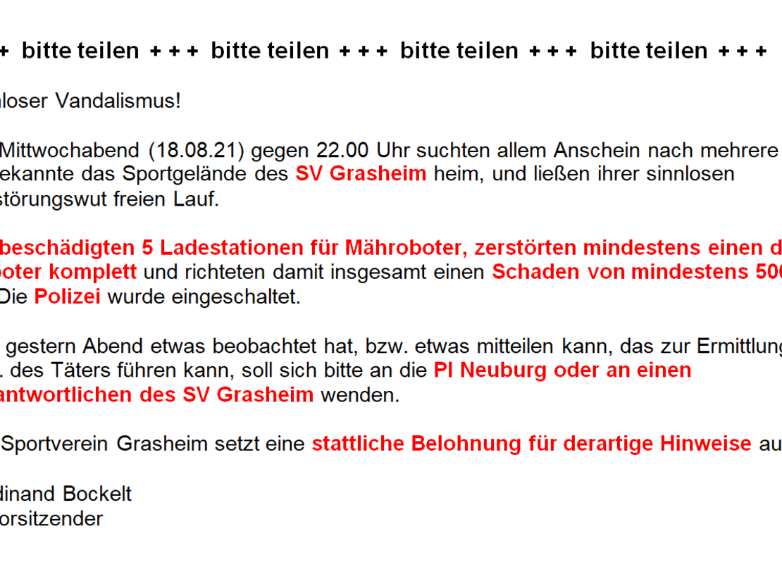 Sinnloser Vandalismus! Am Mittwochabend (18.08.21) gegen 22.00 Uhr suchten allem Anschein nach mehrere Unbekannte das Sportgelände des SV Grasheim heim, und ließen ihrer sinnlosen Zerstörungswut freien Lauf. Sie beschädigten 5 Ladestationen für Mähroboter, zerstörten mindestens einen der Roboter komplett und richteten damit insgesamt einen Schaden von mindestens 5000,- € an. Die Polizei wurde eingeschaltet. Wer gestern Abend etwas beobachtet hat, bzw. etwas mitteilen kann, das zur Ermittlung der bzw. des Täters führen kann, soll sich bitte an die PI Neuburg oder an einen Verantwortlichen des SV Grasheim wenden. Der Sportverein Grasheim setzt eine stattliche Belohnung für derartige Hinweise aus. Ferdinand Bockelt 1. Vorsitzender
