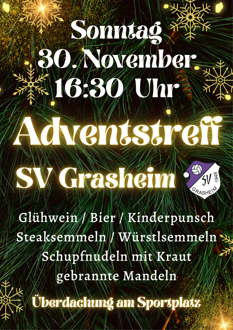 Adventstreff am Sonntag, den 30. November ab 16:30 Uhr bei uns am Sportheim in Grasheim. Ihr seid alle recht herzlich bei uns willkommen! Wir freuen uns auf Euch!